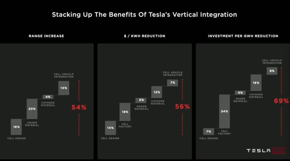 Según Elon Musk, la razón para frenar un avance definitivo de la propulsión eléctrica en el automóvil se basa en el elevado precio y características de duración y recarga del sistema de baterías. Para solucionar lo primero expone un plan de integración vertical en el diseño y la fabricación de baterías que, según sus cálculos debe revertir en una mejora de un 54% en el alcance, un 56% en el precio y un 69% en la inversión de capital para la fabricación. Así detallado en la proyección que acompañaba la propuesta.